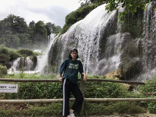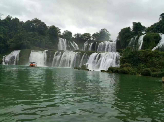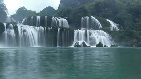 德天瀑布與越南的板約瀑布連為一體,就像一對親密的姐妹,裊裊婷婷,攜手而立。德天瀑布也是火熱電視劇《花千骨》的取景地,大家也是紛紛拍照作為留念,我們這位同學(xué)的架勢是要跟大山瀑布融為一體的節(jié)奏呀!